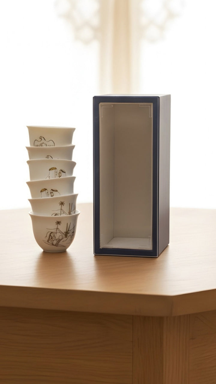 أضف لمسة من الأصالة والتراث الإماراتي العريق إلى تجربة قهوتك مع طقم الفناجين الرائع هذا. مصمم بعناية فائقة ليعكس روح التقاليد الإماراتية الغنية، هذا الطقم المكون من 6 فناجين يجسد قصصاً من الصحراء والجو وصناع تاريخ الإمارات.