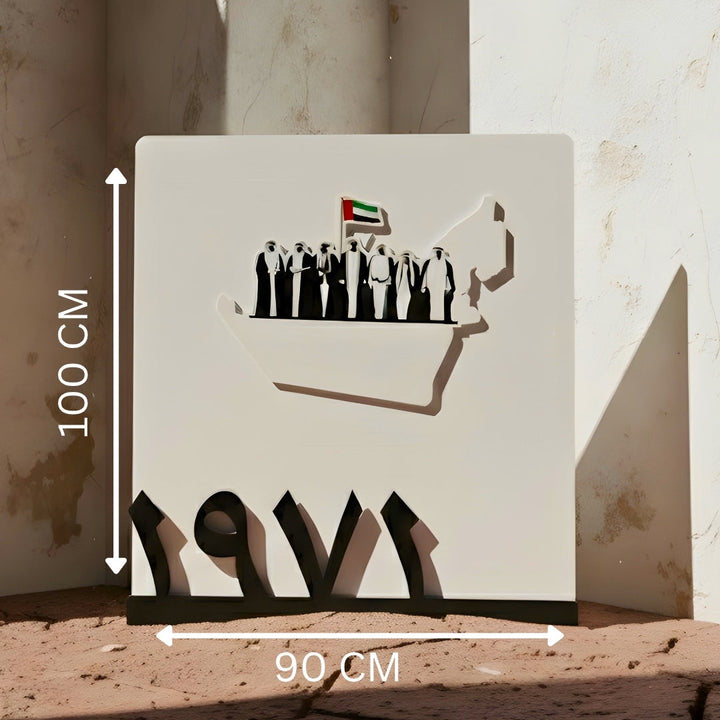 لوحة فنية فاخرة تجمع خريطة دولة الإمارات مع صور القادة لحظة إعلان قيام الاتحاد. قطعة ديكور مُعبّرة تضيف هيبة وفخر لأي مجلس، مكتب، أو مدخل استقبال